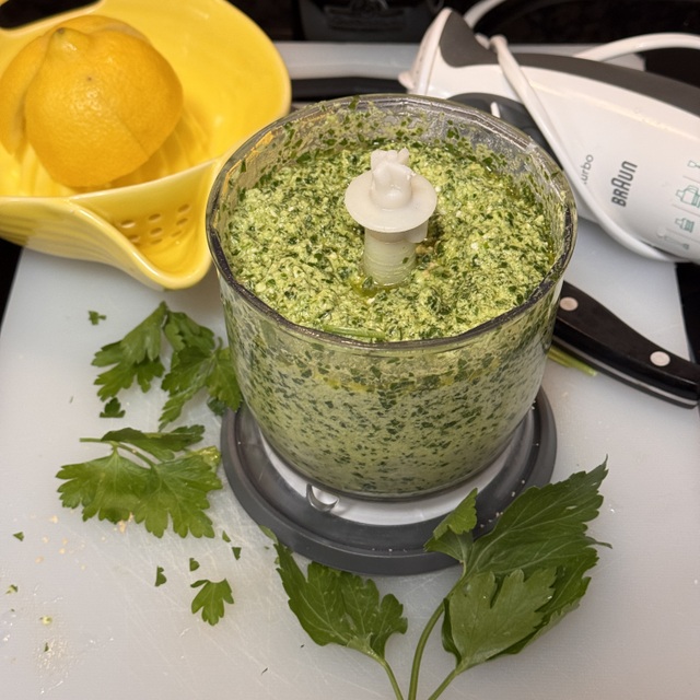 Well I wasn’t about to try the mortar and pestle on this one, given the sheer amount of the parsley but up to you. Put the lemon juice, garlic, olive oil and parsley in a blender or food processor and pulse-blend until well mixed. Then add the crumbled feta, chopped almonds, pepper and chilis and blend until desired consistency is reached. You may want to stir in a bit of extra olive oil.